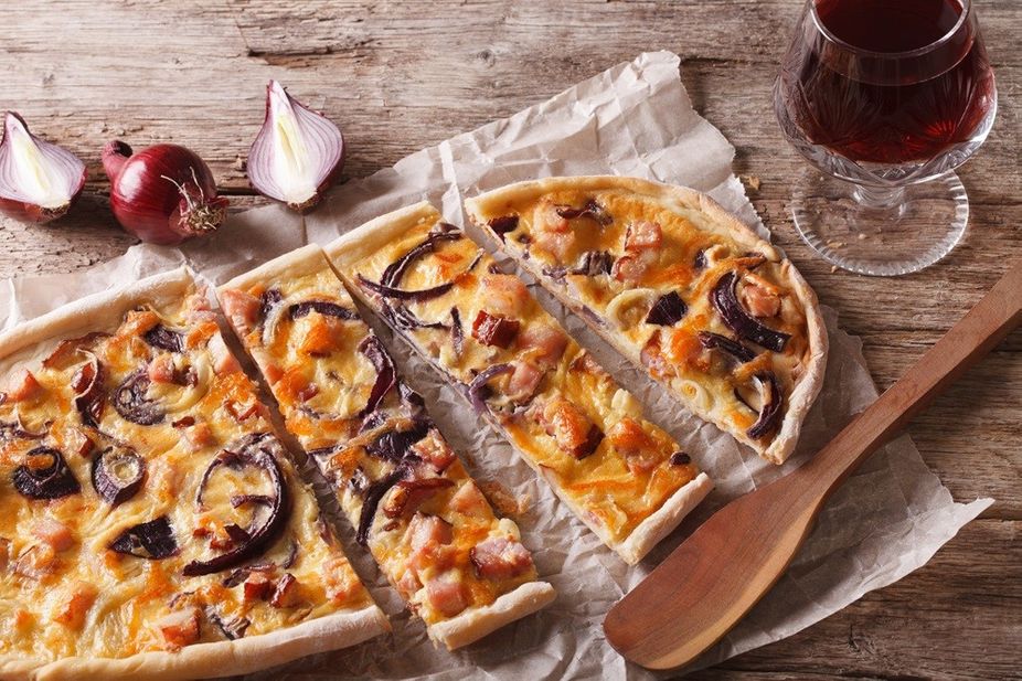 This tarte flambée au Munster recipe offers a spin on what is perhaps the most well-known of dishes from Alsace, here topped with Munster cheese, another speciality of the region. Served with a crisp glass of Gewürztraminer, this is a fantastic sharing dish for a get-together with friends and family.
