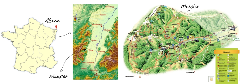 Munster cheese is still made today in the areas either side of the Vosges mountains, namely the Alsace and Lorraine regions of Eastern France, close to the German and Swiss borders. This has always been the case, certainly since around 1371, when there is evidence of the "Admodiation":
