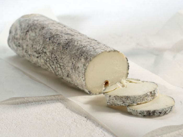 This cheese is ladled into cylindrical moulds, then rolled in ash and is ripened for a minimum of 11 days during which it is turned regularly. This Sainte-Maure-styled cheese has a delicate, bloom covered rind and a firm, smooth texture.