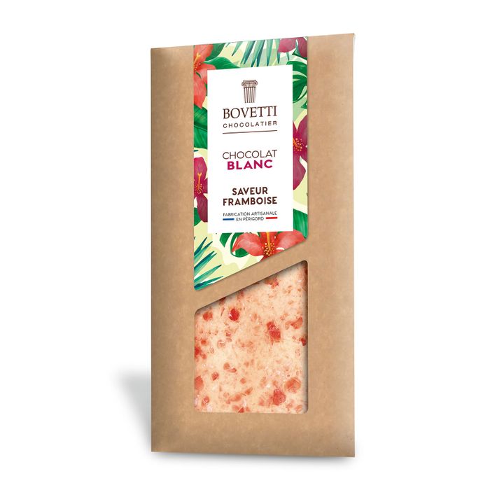 Experience a unique taste sensation with this white chocolate bar flavored with raspberry. Each square of this bar embodies the perfect harmony between the creaminess of white chocolate and the tartness of raspberry. Each bite transports you to a world of exquisite flavours, where the finest ingredients are meticulously selected to offer the best of chocolate. Prepared with passion by the master chocolatier BOVETTI, this bar is the result of authentic craftsmanship. Let yourself be carried away by temptation and savour every moment of this pure chocolatey delight.