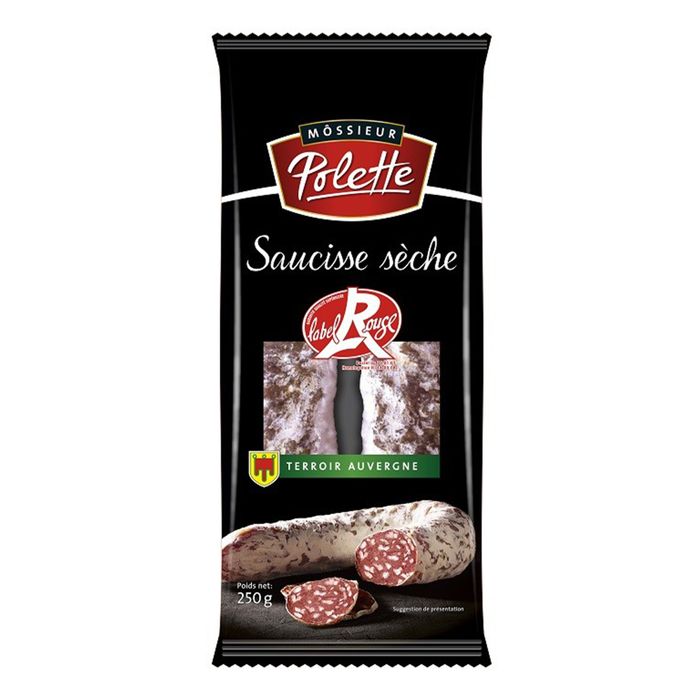 Experience an authentic taste of France with Môssieur Polette's Red Label Auvergne PGI Curved Dry Sausage. This high-quality sausage is crafted from 100% pure French pork, seasoned with aromatic ingredients including salt, pepper, garlic, and nutmeg. Renowned for its robust, savory flavor, this dry sausage is a perfect addition to your charcuterie board. Crafted in the traditional style of the Auvergne region, this sausage carries the PGI label, indicating its quality, authenticity, and regional origin.